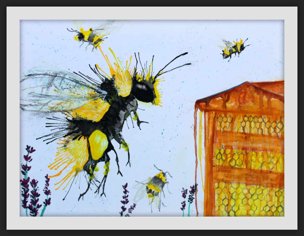 This piece was a commission for a beekeeper! Wayne had won a giraffe piece in the auction and wanted another personal piece and bees being his passion he asked if a could create a piece with a traditional hive. He did not mind if it was “one bee or lots and anything else you want to add in”